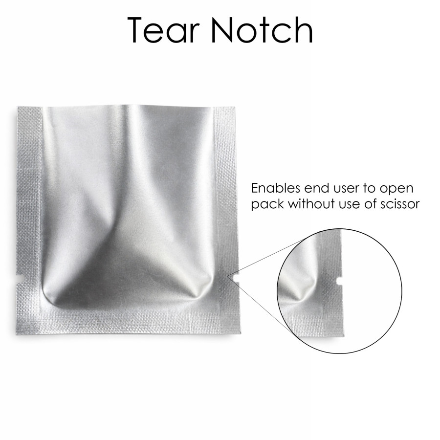 Tags: 60x60mm, Silver, Matt, 3 Side Seal, Tear Notches, Heat Sealable, bottom open, Sachet,